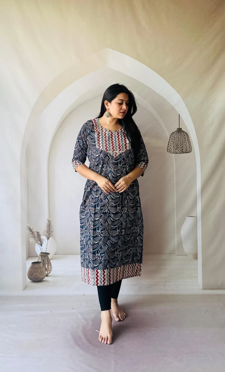 Embrace timeless elegance with our Handblock Print Pure Natural Dye Cotton Straight Kurti, crafted from 100% pure cotton and adorned with exquisite handblock prints. Each piece is naturally dyed, giving it an authentic earthy charm and skin-friendly comfort.